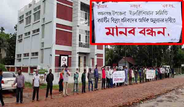 কমলগঞ্জ প্রতিনিধিঃ মৌলভীবাজারের কমলগঞ্জে করোনাভাইরাস সংক্রমণের কারনে কর্মহীন হয়ে পড়া ইলেক্টিশিয়ান ও ডেকোরেটার্স সমিতির সদস্যরা সরকারি ভাবে আর্থিক প্রনোদনার দাবীতে মানববন্ধন পালন করে।