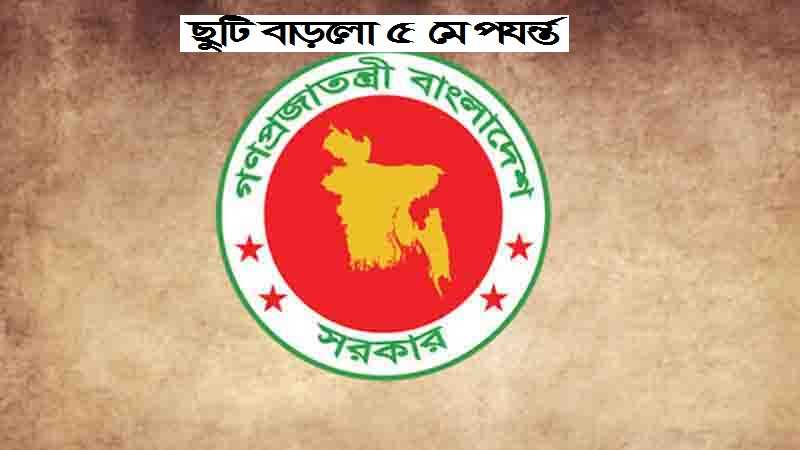 এরপর ১৪ এপ্রিল এবং সর্বশেষ ২৫ এপ্রিল পর্যন্ত ছুটি বাড়ানো হয়।করোনাভাইরাসের কারণে প্রথম দফায় ২৬ মার্চ থেকে ৪ এপ্রিল পর্যন্ত ছুটি দেয়া হয়েছিল। এরপর ছুটি বাড়িয়ে তা ১১ এপ্রিল করা হয়। ছুটি তৃতীয় দফা বাড়িয়ে করা হয় ১৪ এপ্রিল পর্যন্ত। এরপর চতুর্থ দফায় ২৫ এপ্রিল পর্যন্ত ছুটি বাড়ানো হয়। এবার পরিস্থিতি বিবেচনায় নিয়ে পঞ্চম দফায় ৫ মে পর্যন্ত ছুটি বাড়ানো হল।