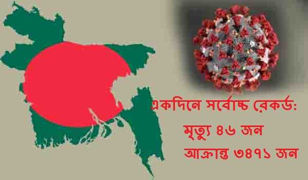 করোনা আপডেট: দেশে একদিনে মৃত্যু ও আক্রান্তের সংখ্যার হিসাবে এটিই সর্বোচ্চ। গত ২৪ ঘণ্টায় দেশে সর্বোচ্চ ৩ হাজার ৪৭১ জন কোভিড-১৯ আক্রান্ত রোগী শনাক্ত হয়েছেন। আজ করোনাভাইরাসে আক্রান্ত হয়ে আরও ৪৬ জনের মৃত্যু হয়েছে।